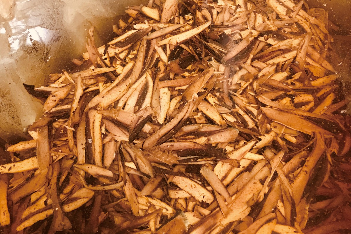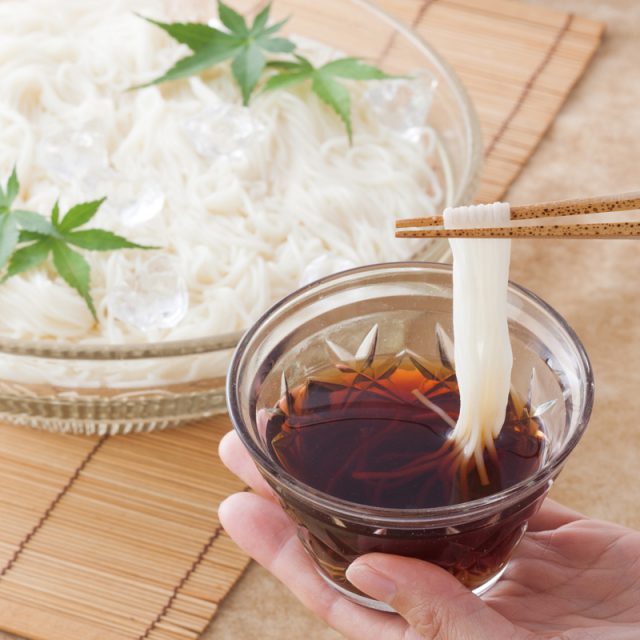 鰹節は、一般的なめんつゆの倍量を、おしげもなく使用。自社で厚削りしたかつお節を使用。「枯節の厚削り」(枕崎産)、こっくりと深みある味を出す「荒節厚削り」(枕崎産)、味とコクに加え濃厚な香りがしっかり出る「宗田鰹」(国産)の3種を混合した贅沢さです。