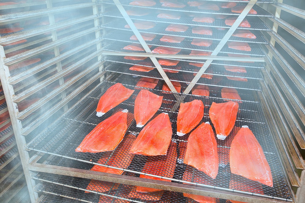 鮭を塩水に漬けるのではなく、手作業でふり塩をして塩加減を調整し、うまみを凝縮したスモークサーモン。