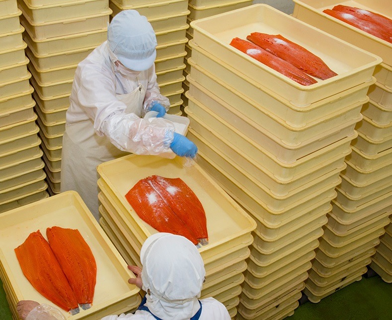 原材料となる鮭は、北海道道東沖のカムチャッカ半島に遡上する秋鮭のオスの「レッド」のみ。一般的に秋鮭は、漁期が後半になるにつれて身の色が白っぽくなり、うまみを失う傾向にあり、「レッド」、「ピンク」、「ホワイト」とランク分けされます。「レッド」は一番上に格付けされ、身の色も味も共に良いのが特徴です。