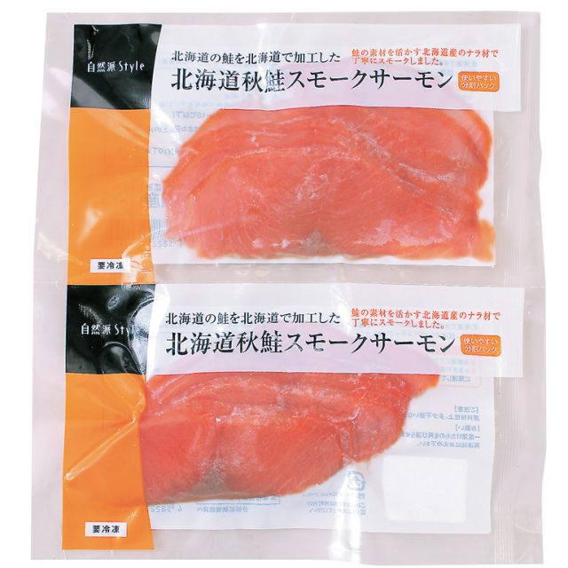 北海道産の秋鮭を北海道産のナラ材で燻したスモークサーモンです。低温でゆっくりと時間をかけながら燻しているので、口あたりしっとり。