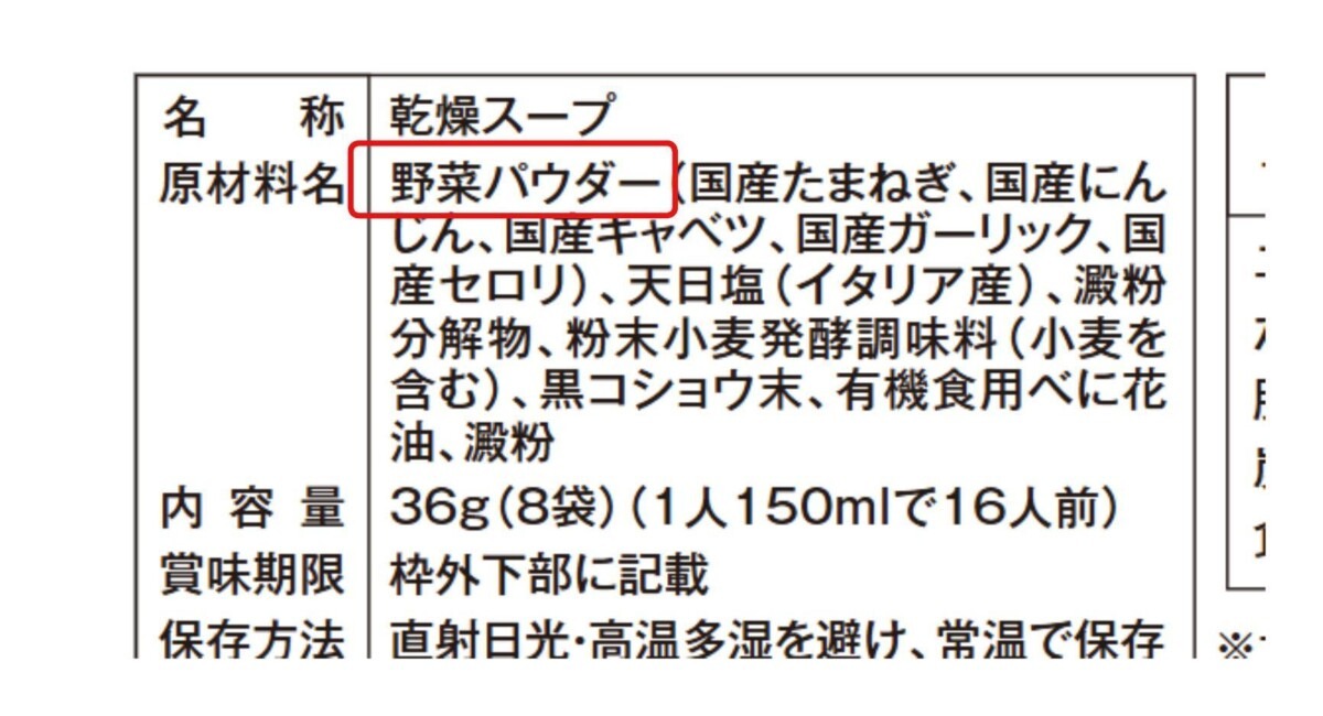 | 原材料 | 野菜パウダー(国産たまねぎ、国産にんじん、国産キャベツ、国産ガーリック、国産セロリ)、天日塩(イタリア産)、澱粉分解物、粉末小麦発酵調味料(小麦を含む)、黒コショウ末、有機食用べに花油、澱粉 ※本製品工場では、アレルゲン特定原材料8品目のうち、えび・かに・くるみ・そば・卵・乳成分・落花生を含む製品を製造しています。 |
