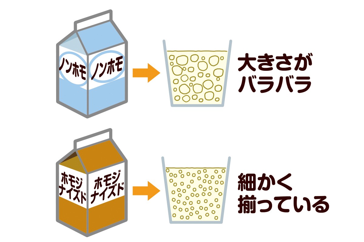 生乳の栄養や脂肪などの成分分子は、サイズにバラつきがあります。脂肪分はサイズが大きく上のほうに浮いてくるため、ほかの栄養素などと同じくらいの大きさに砕く工程を均質化(ホモジナイズ)と呼びます。それをしない牛乳(ノンホモジナイズ)は時間が経つと、乳脂肪分がクリーム状になって浮いてきます。