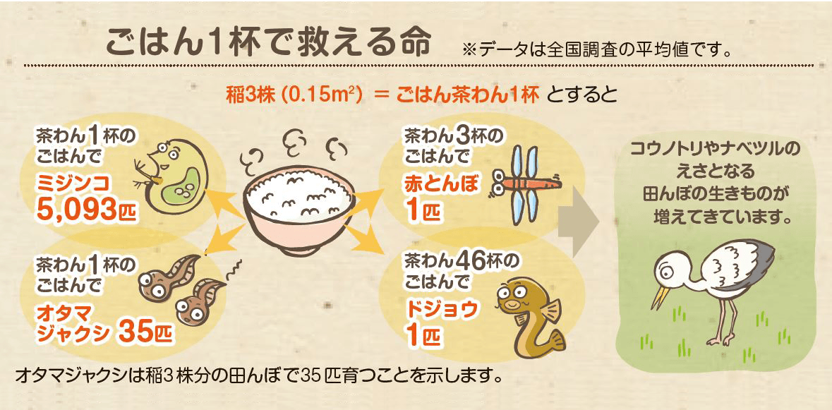 生産地では秋の稲刈り直後から来年の米作りに向けてしっかり病気や害虫に強い土づくりを行い、冬には田んぼに水を張って(冬水田んぼ)、ナベヅルやコウノトリの休息地とえさ場となる生きもの豊かな環境を作ります。田んぼの中で息づくイトミミズが作ったドロの層(トロトロ層)は、強い稲を育てる養分が豊富な上、雑草の種を沈め発芽の抑制に。また、農薬に頼らない田んぼの中には動植物が共棲し、食物連鎖のいのちのサイクルが繰り広げられています。例えばカエルやクモ。お米の大敵「カメムシ」はカエルやクモの大好物です。生態系を壊さなければ自然に数が調節され、大発生などは起こりません。「ツルをよぶお米」はこうした生きものたちのチカラも借りて作られています。