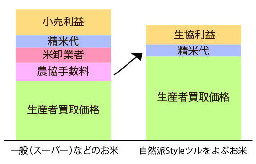 「ツルをよぶお米」の精米や保管は、生協から分社化したコープ有機※が行っています。図のように、中間業者を少なくし、生産者買取価格を上げ、組合員さんには安く供給することを実現。生産者買取価格を上げたことは、生産者の意欲と栽培技術の向上にもつながっています。