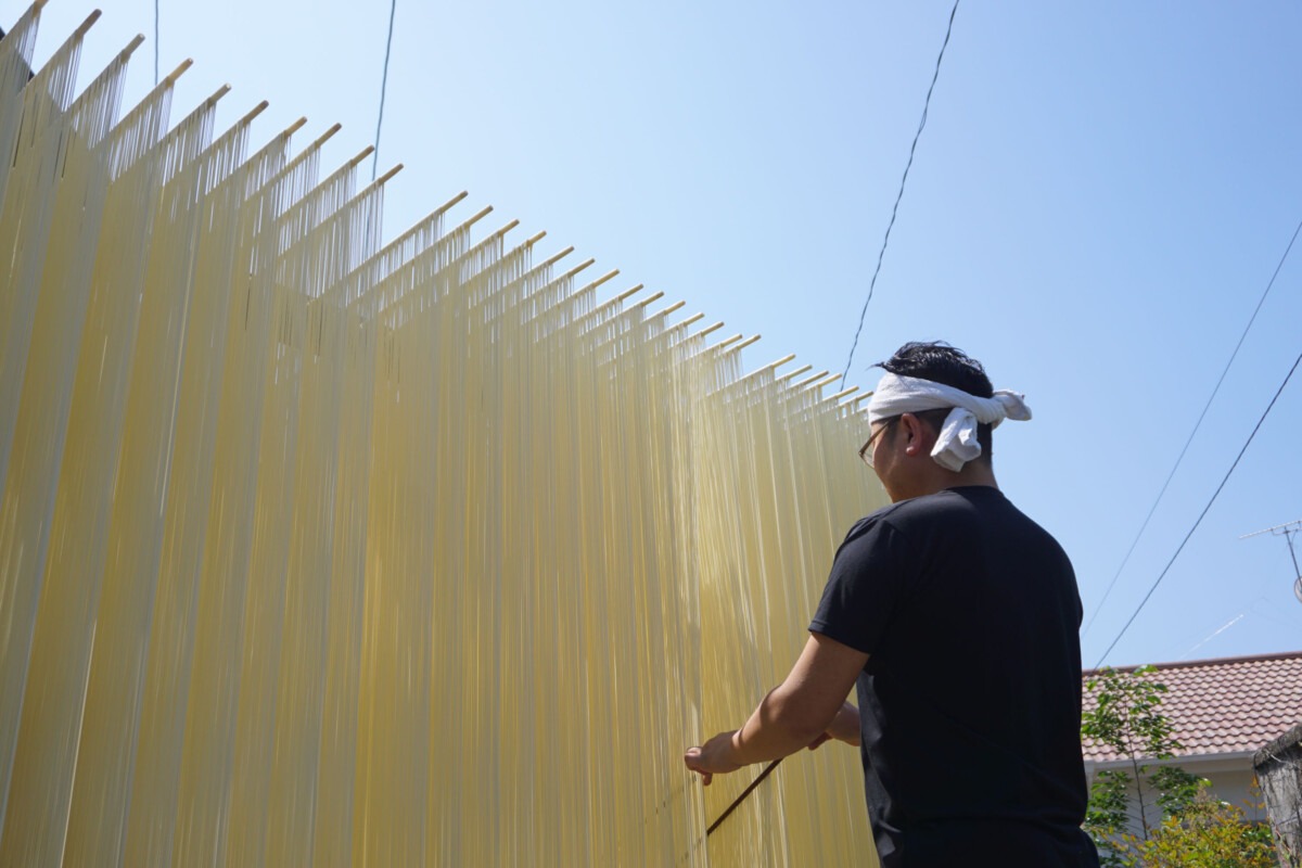 「自然派Style小豆島手延べ素麺」は自然の風と光を当てる「天日干し」を行います。太陽の位置や風向きを確認しながら干す位置を調整。穏やかな風に麺が揺られながら少しずつ乾燥がすすみます。太陽の光に当てることで麺はより白くなり、でんぷん質が変化してたんわりと弾力のある麺に仕上がります。