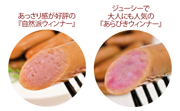 自然派Styleポークウィンナーは、新鮮な国産豚ウデ肉を、塩・砂糖・香辛料とともに、肉の粒が見えなくなるまで練ってなめらかな食感を作り、自然派Styleあらびきウィンナーは、新鮮な国産豚ウデ肉を粗めに挽いて、肉の食感と肉汁のジューシーさを際立たせています。