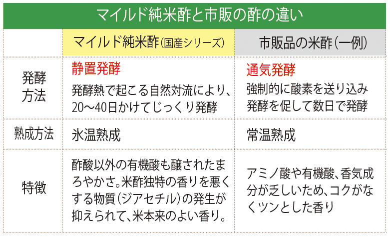 国産米をたっぷり使い、「静置発酵」・「氷温熟成」で仕上げた“純”米酢です。「きちんと発酵・しっかり熟成」にこだわったからこそできた香りの良さとまろやかな酸味が自慢です。