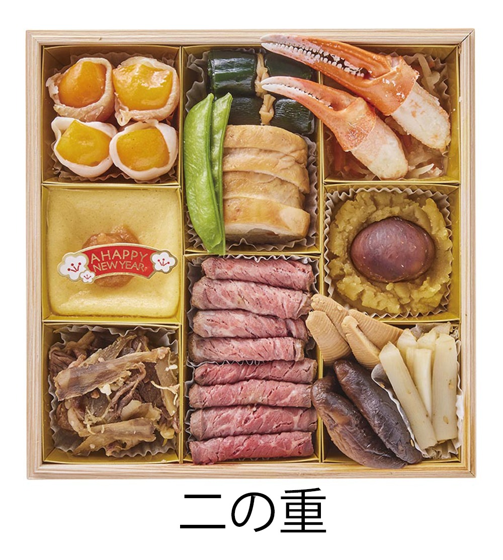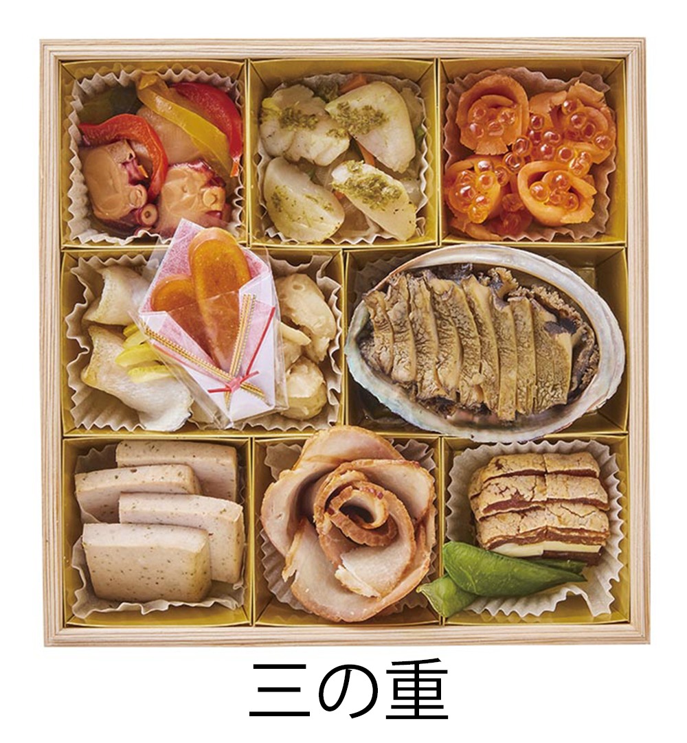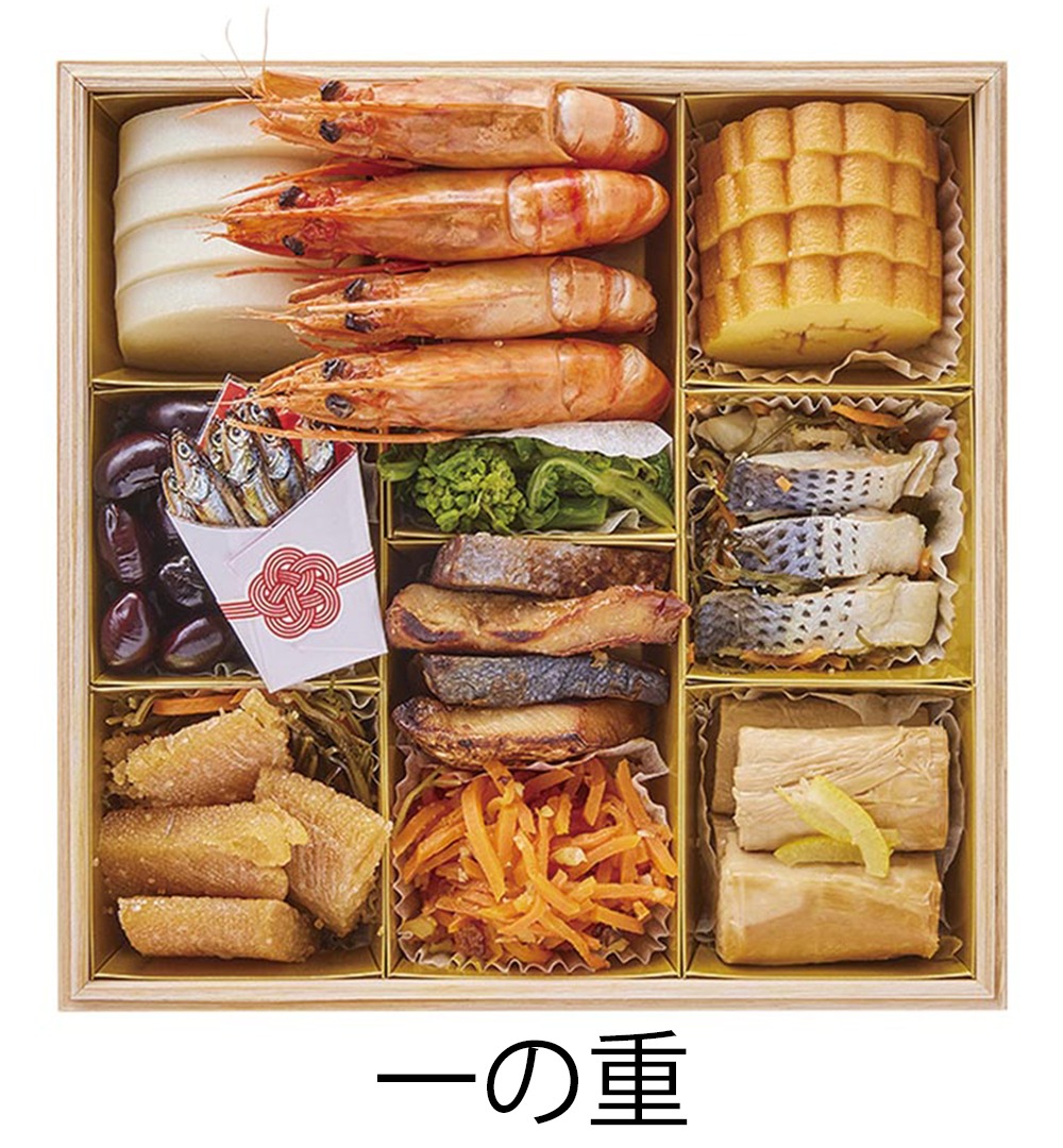 | 原材料 | <一の重> 【小田原かまぼこ・白】魚肉すり身(グチ(ミャンマー産)、タラ(チリ産)、砂糖)、砂糖、米発酵調味料、食塩、馬鈴薯でん粉、【祝い海老(粗放養殖)】えび(ベトナム産)(ブラックタイガー)、しょうゆ(小麦・大豆を含む)、砂糖、清酒、米発酵調味料、水あめ、【千葉県産菜の花のお浸し】菜の花(千葉県産)、めんつゆ(しょうゆ(小麦・大豆を含む)、米発酵調味料、ふし(むろあじ、そうだかつお、かつお)、砂糖、乾椎茸、昆布)、【伊達巻(有精卵使用)】魚肉すり身(タラ(国産)、砂糖)、鶏卵、砂糖、甘藷でん粉、【国産かたくちいわしの田作り】片口いわし(国産)、砂糖、水あめ、しょうゆ(小麦・大豆を含む)、寒天、【北海道産黒豆の煮豆】黒豆(北海道産)、氷砂糖、砂糖、清酒、みりん、ゆず果汁、しょうゆ(小麦・大豆を含む)、食塩、【国産こはだの酢漬け】このしろ(国産)、水あめ、人参(国産)、米酢、砂糖、昆布、生姜(国産)、食塩、数の子(デンマーク産)、【北海道産昆布の煮物(国産有機人参使用)】有機人参(国産)、昆布、めんつゆ(しょうゆ(小麦・大豆を含む)、砂糖、みりん、食塩、かつお節エキス、むろあじ節、かつお節、乾椎茸、いわし煮干し、昆布)、【北海道産にしんの味付け数の子】数の子(北海道産)、米発酵調味料、しょうゆ(小麦・大豆を含む)、有機白だし(有機しろしょうゆ(小麦・大豆を含む)、有機米発酵調味料、食塩、有機砂糖、かつお枯節削り、有機乾椎茸、昆布)、【国産天然鰤の味噌焼き】鰤(国産)、味噌(大豆を含む)、砂糖、清酒、みりん、食塩、【有機くるみとレーズンのキャロットラペ(国産有機人参使用)】キャロットラペ(有機人参(国産)、食用オリーブ油、砂糖、ぶどう酢、食塩、香辛料)、有機くるみ、有機レーズン、【手作り比叡ゆばの旨煮(徳島県産有機ゆず使用)】ゆばの旨煮(大豆(滋賀県産)、米発酵調味料、しょうゆ(小麦・大豆を含む)、砂糖、かつおだしの素)、有機刻みゆず(徳島県産) <二の重> 【九州産金柑甘露煮と北海道産クリームチーズの自然豚生ハム巻】生ハム(豚ロース肉(国産)、食塩、清酒、香辛料)、ナチュラルチーズ(国内製造)、金柑甘露煮(金柑(九州産)、砂糖)、【北海道産昆布の宝巻き】昆布巻(昆布(北海道産)、かんぴょう(国内製造))、砂糖、しょうゆ(小麦・大豆を含む)、水あめ、【神山鶏ごぼうと人参のロールチキン(国産有機人参・ごぼう使用)】鶏むね肉(国産)、鶏皮(国産)、たれ(しょうゆ(小麦・大豆を含む)、生姜、砂糖、馬鈴薯でん粉、昆布粉)、有機ごぼう(国産)、有機人参(国産)、砂糖、【紅白なます(国産有機人参・徳島県産有機ゆず使用)】大根(国産)、砂糖、有機米酢、有機人参(国産)、食塩、有機刻みゆず(徳島県産)、【国産紅ずわい蟹の八芳酢漬け】紅ズワイガニ(国産)、調味酢(醸造酢(米酢、りんご酢)、砂糖、食塩、昆布かつおだし、レモン果汁)、【りんごのベイクドチーズケーキ(ネオニコフリーりんご使用)】クリームチーズ(国内製造)、生クリーム(乳成分を含む)、鶏卵、砂糖、りんご、パルメザンチーズ、玄米粉、有機レモン果汁、シナモンパウダー、【国産渋皮付栗甘露煮】栗(国産)、砂糖、【鳴門金時芋餡】さつまいもペースト(さつまいも(徳島県産))、砂糖、水あめ、食塩、【国産牛肉のしぐれ煮(国産有機ごぼう使用)】牛もも肉(国産)、清酒、有機ごぼう、砂糖、米発酵調味料、しょうゆ(小麦・大豆を含む)、生姜、【枕崎牛・神居牛ローストビーフ(国産有機たまねぎを使ったドレッシング20g)】ローストビーフ(牛肉(国産)、食塩、胡椒)、たれ(有機米酢、なたね油、有機たまねぎ、砂糖、しょうゆ(小麦・大豆を含む)、食塩、コーンスターチ、昆布、有機人参、有機レモン、香辛料)、【国産きぬさや】きぬさや(国産)、【九州産竹の子穂先】竹の子水煮(竹の子(九州産))、しょうゆ(小麦・大豆を含む)、砂糖、清酒、米発酵調味料、かつおだしの素、食塩、【九州産有機原木栽培椎茸のうま煮】有機椎茸(九州産)、しょうゆ(小麦・大豆を含む)、砂糖、水あめ、食塩、【甘酢ごぼう(国産有機ごぼう使用)】有機ごぼう(国産)、有機米酢、砂糖、白ごま、しょうゆ(小麦・大豆を含む)、食塩、かつおだしの素 <三の重> 【たこの中華マリネ(ネオニコフリーパプリカ使用)】たこ(国産)、きゅうり(国産)、たまねぎ(国産)、パプリカ(国産)、人参(国産)、調味酢(醸造酢(米酢、りんご酢)、砂糖、食塩、昆布かつおだし、レモン果汁)、しょうゆ(小麦・大豆を含む)、ごま油、砂糖、【グリル帆立の有機バジルソース添え】ほたて貝(北海道産)、有機バジルペースト(有機バジル、有機植物油脂、有機じゃがいも、食塩、有機レモン果汁、有機松の実)、【国産野菜3種のマリネ】野菜(たまねぎ(国産)、人参(国産)、ピーマン(国産))、食用なたね油、米酢、砂糖、食塩、胡椒、【北海道産秋鮭の味付けいくら】いくら(北海道産)、有機白だし(有機しろしょうゆ(小麦・大豆を含む)、有機米発酵調味料、食塩、有機砂糖、かつお枯節削り、有機乾椎茸、昆布)、【北海道産秋