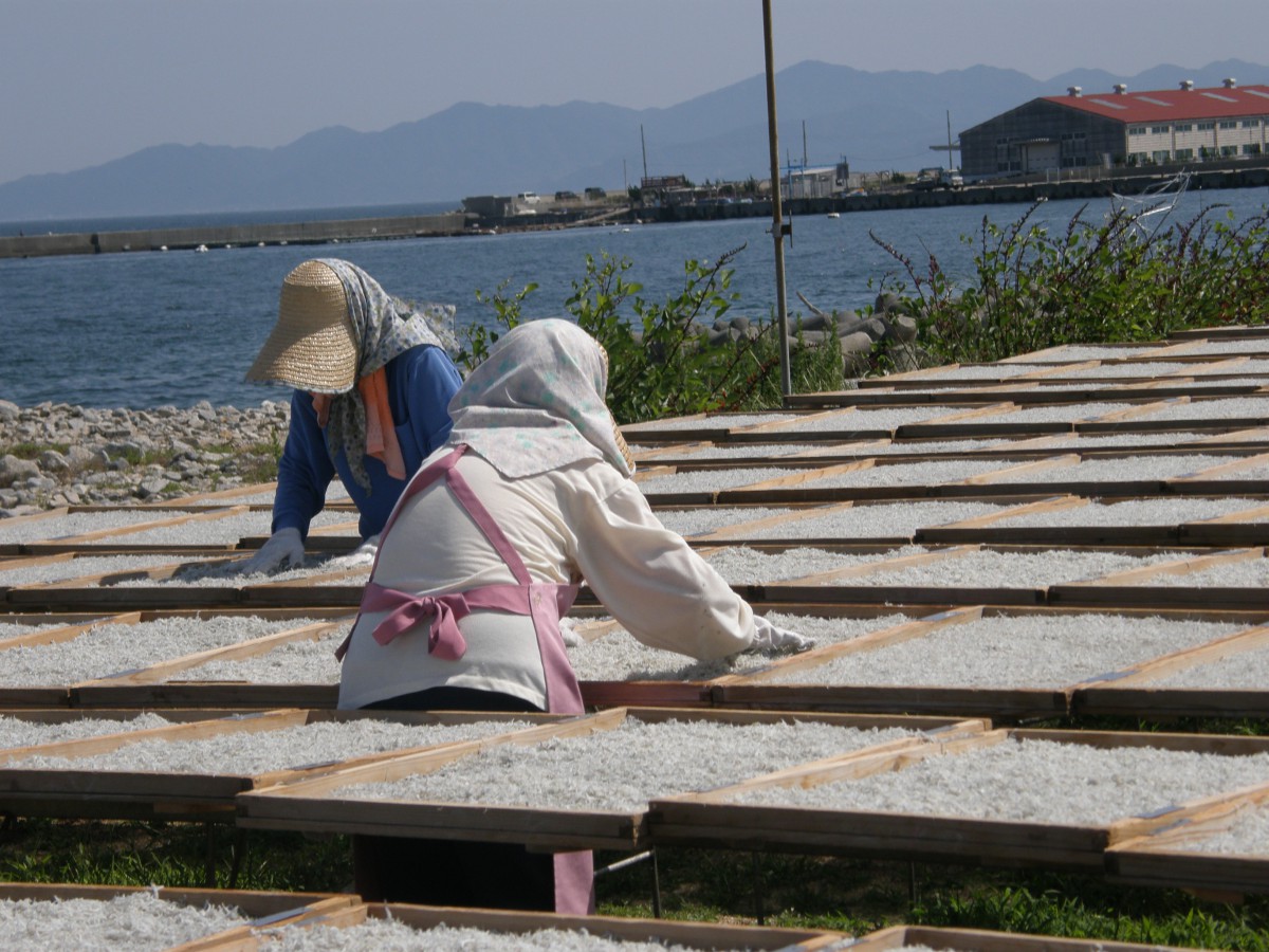 釜ゆで後は、冷まして天日干しにしています。潮風にさらしながら天日干しすることで、機械乾燥には出せないやわらかさと、しっかりとした風味を引き出すことができます。