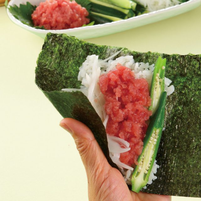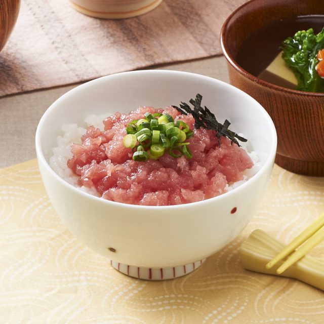 原料の天然メバチマグロは、資源にやさしい「はえ縄漁」で漁獲し、船内ですぐに冷凍した鮮度の良いものを使用。スジを一つ一つていねいに除去してから身の粒感を残すようにたたき身にしてあるので、食感も楽しめます。