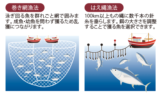 しかし近年、「巻き網漁」が主体となり、大小含めたマグロが一網打尽に漁獲され、幼魚の乱獲による資源の枯渇が指摘されています。限りある水産資源としてのマグロを守るためにもはえ縄漁法は必要です。