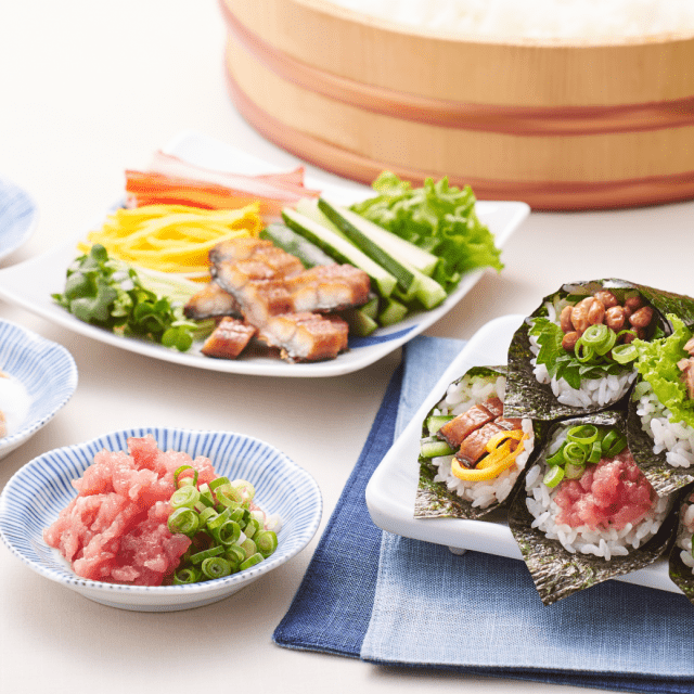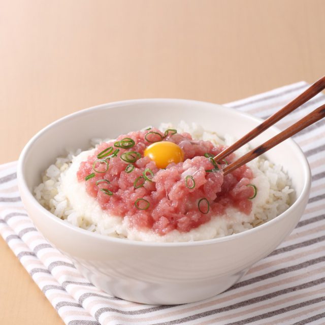 原料の天然メバチマグロは、資源にやさしい「はえ縄漁」で漁獲し、船内ですぐに冷凍した鮮度の良いものを使用。スジを一つ一つていねいに除去してから身の粒感を残すようにたたき身にしてあるので、食感も楽しめます。