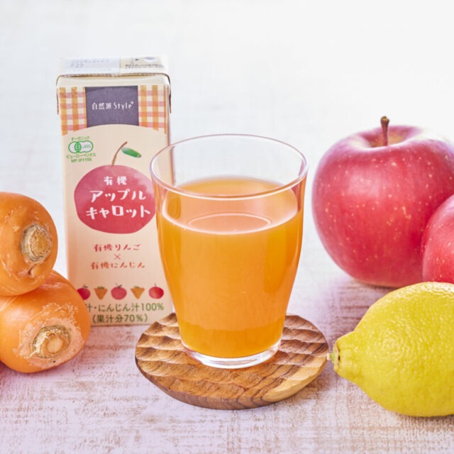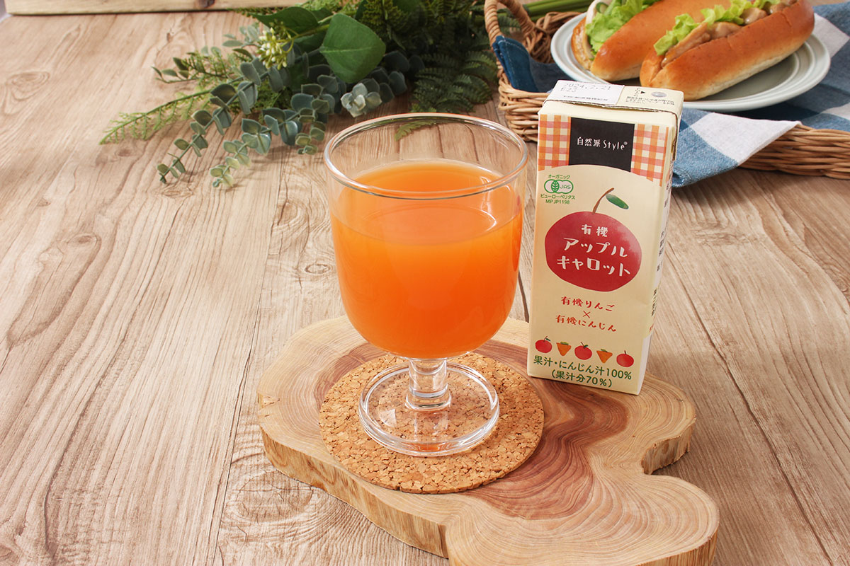 有機栽培のりんごと国産有機にんじんの自然な甘みを活かしたオーガニックジュースです。砂糖、香料不使用。