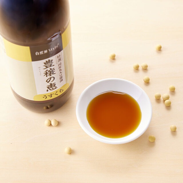 好評の自然派Style特選丸大豆醤油「豊穣の恵」のこだわりそのままの、うす口醤油です。「低温熟成製法」で発酵後期のもろみを徹底管理することで、旨みと香りを損なわずに、色だけを淡く仕上げました。