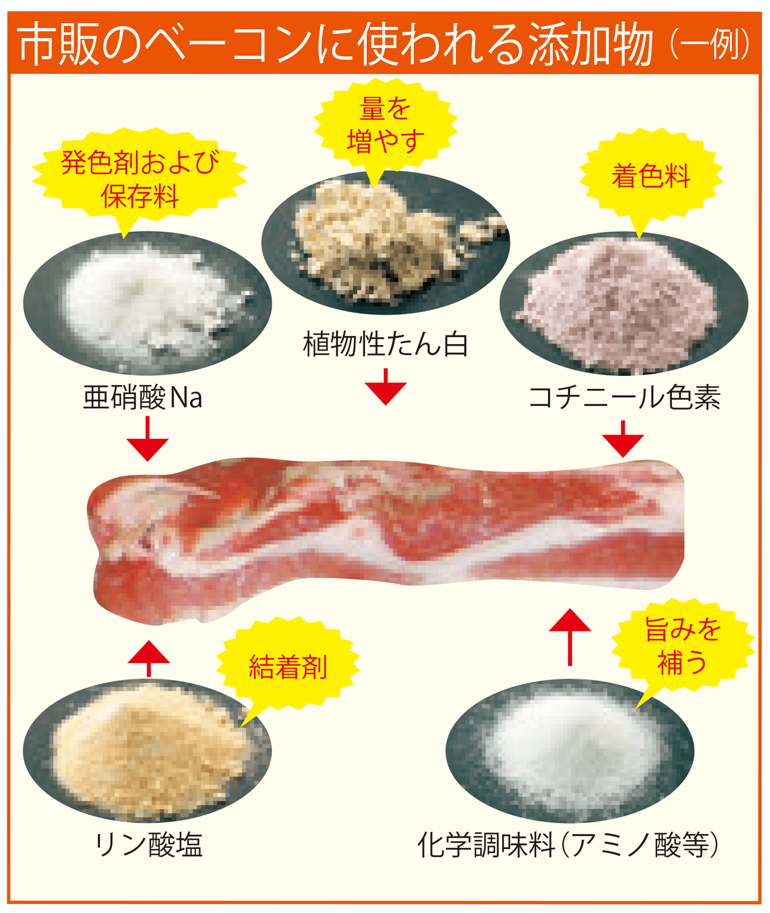 一般的にベーコンに使われる原料は冷凍の輸入肉が多く、 解凍時にドリップ(肉汁)と共に際に流出してしまいがちな旨みや結着力を補うために、様々な食品添加物を使います。でも「自然派Styleバラベーコンスライス」は新鮮な国産豚肉の持つ旨みや食感を最大限に引き出すため、肉の色を鮮やかに見せるための発色剤や肉の結着力や保水力を高めるための結着剤、日持ちを長くする保存料などは不使用!