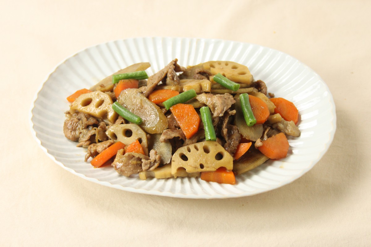 肉の色が変わったら、れんこん、にんじん、ごぼうを加えて炒める。