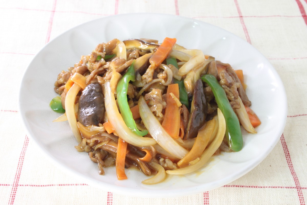 油大さじ1/2を足して玉ねぎ、にんじん、椎茸、ピーマンの順に炒め、全体に火が通ったら肉を戻し入れ、Bを加える。