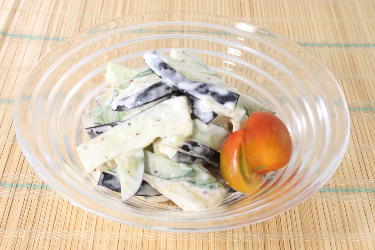 ミニトマトは半分~4等分に切る。 - ボウルにAを入れて混ぜ、なすときゅうりを入れて和える。