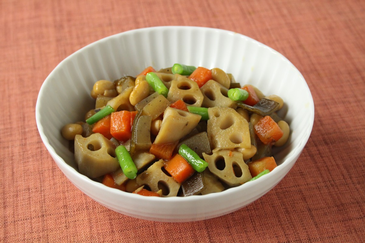 いんげんは茹でて1cm長さに切る。 - 鍋に昆布、こんにゃく、大豆、れんこん、にんじんの順に入れ昆布の戻し汁を入れる。