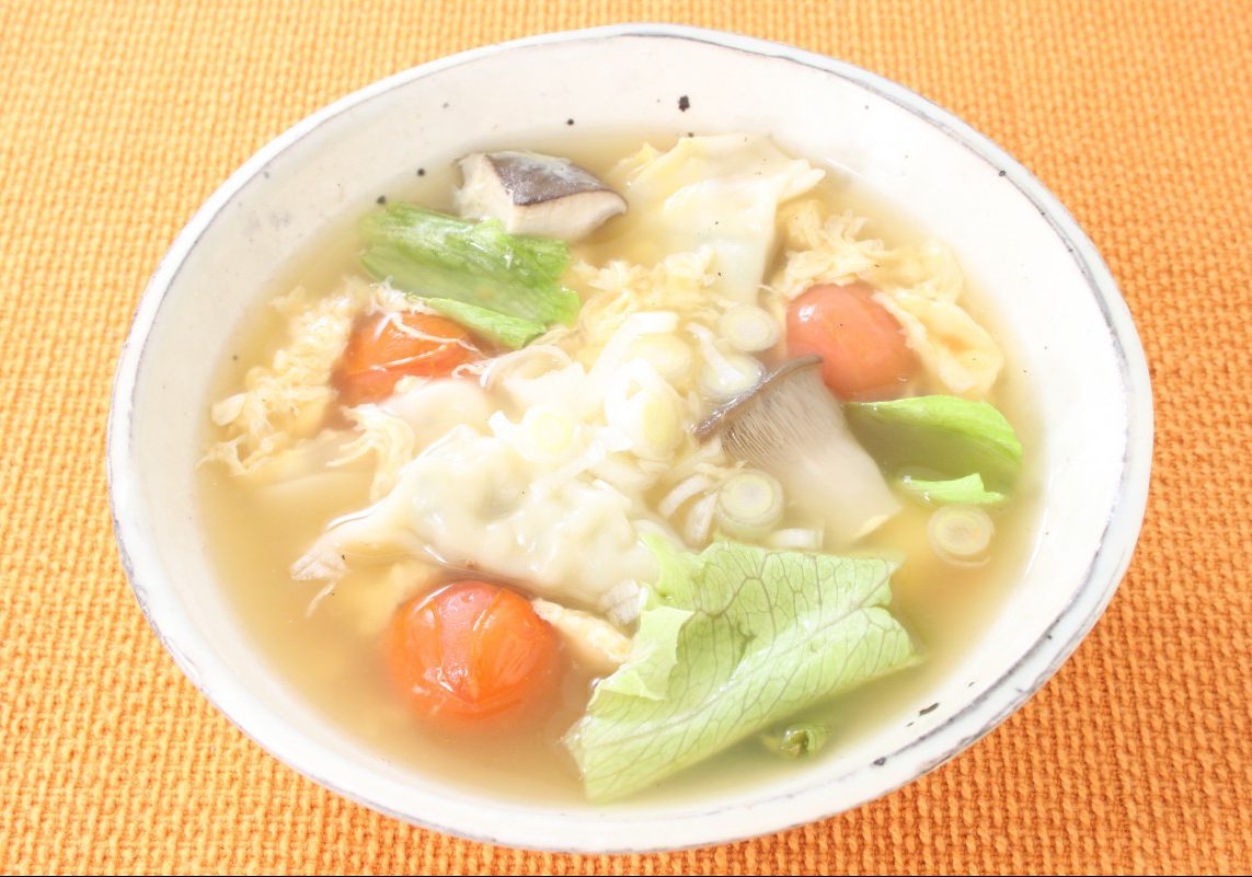 - 鍋に水600mlとチキンコンソメを入れて煮立て、餃子、エリンギを加えて2~3分煮る。