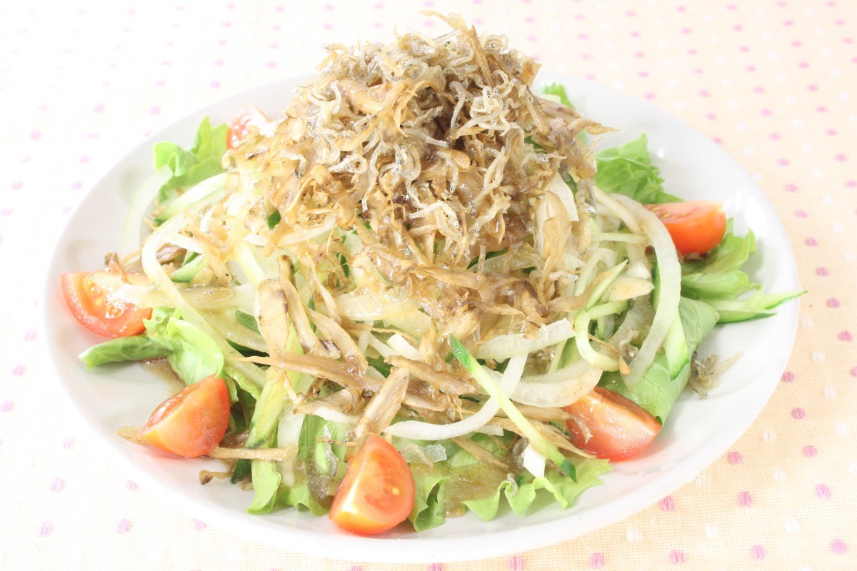 - ボウルに玉ねぎ、きゅうり、自然派style淡路島上乾ちりめんを入れて混ぜ、レタスをしいた器に盛る。