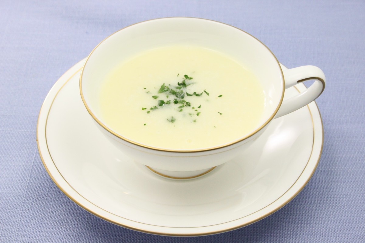 - フライパンにバターを溶かし、玉ねぎとじゃがいもを入れて炒め、たまねぎがしんなりしたら、水300mlを加え、自然派Styleチキンコンソメを入れてじゃがいもが柔らかくなるまで煮る。
