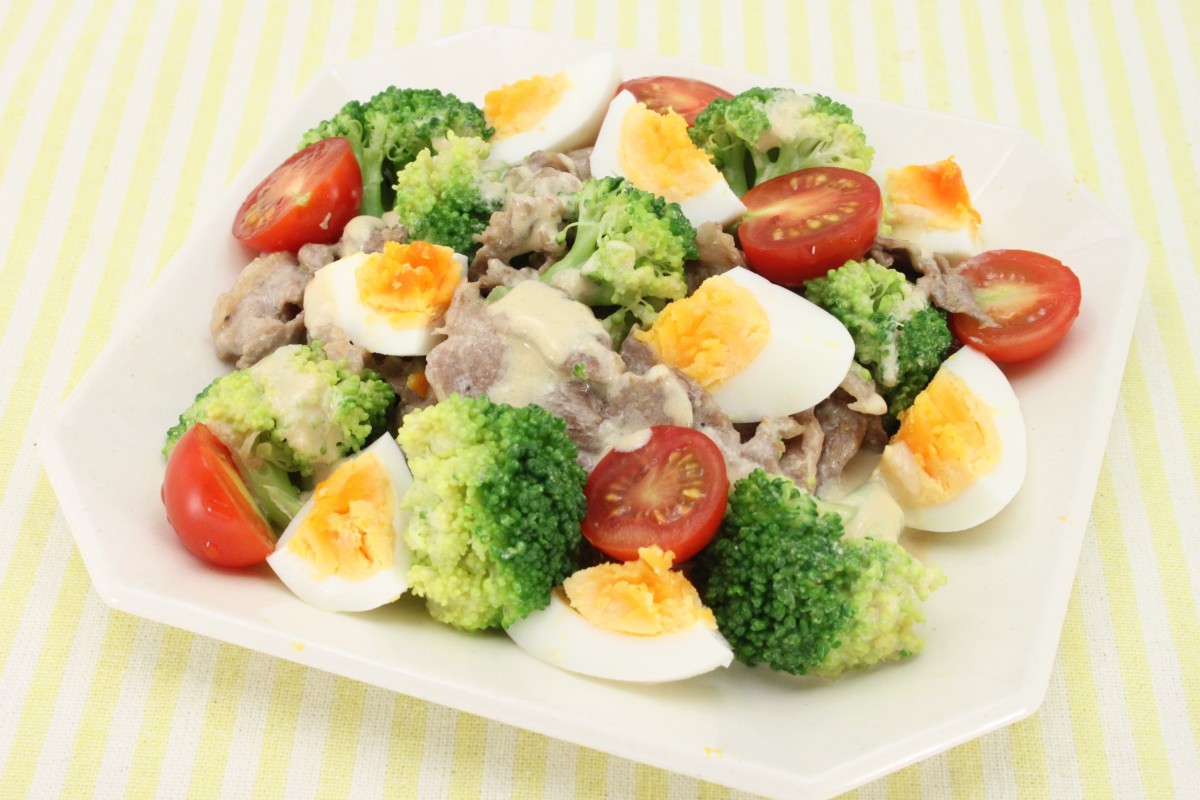 ブロッコリーは小房に分けて熱湯で茹で、水気をきる。 - フライパンに油を熱し、豚肉を入れて塩こしょうをして炒める。