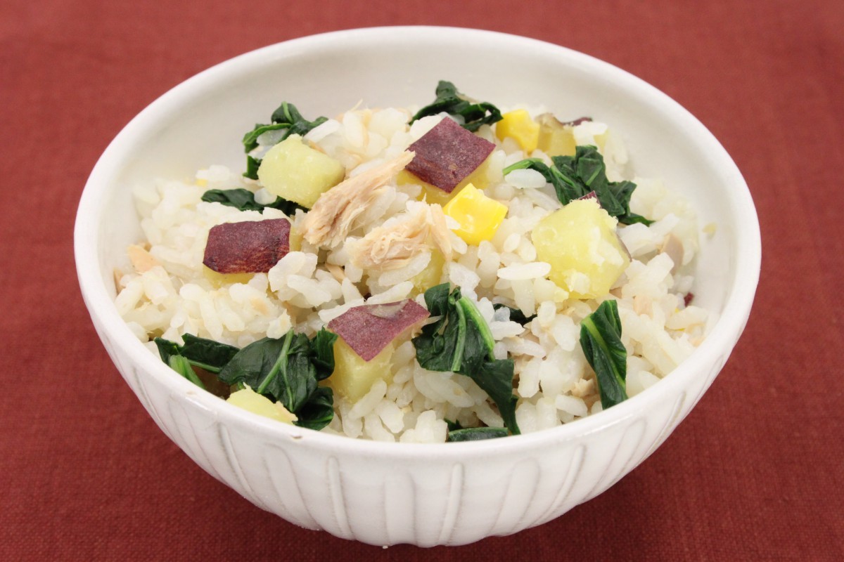 さつまいも、ツナ、コーン、Aを入れてよく混ぜて普通に炊く。 - 炊き上がった②に①のほうれん草を入れて混ぜる。