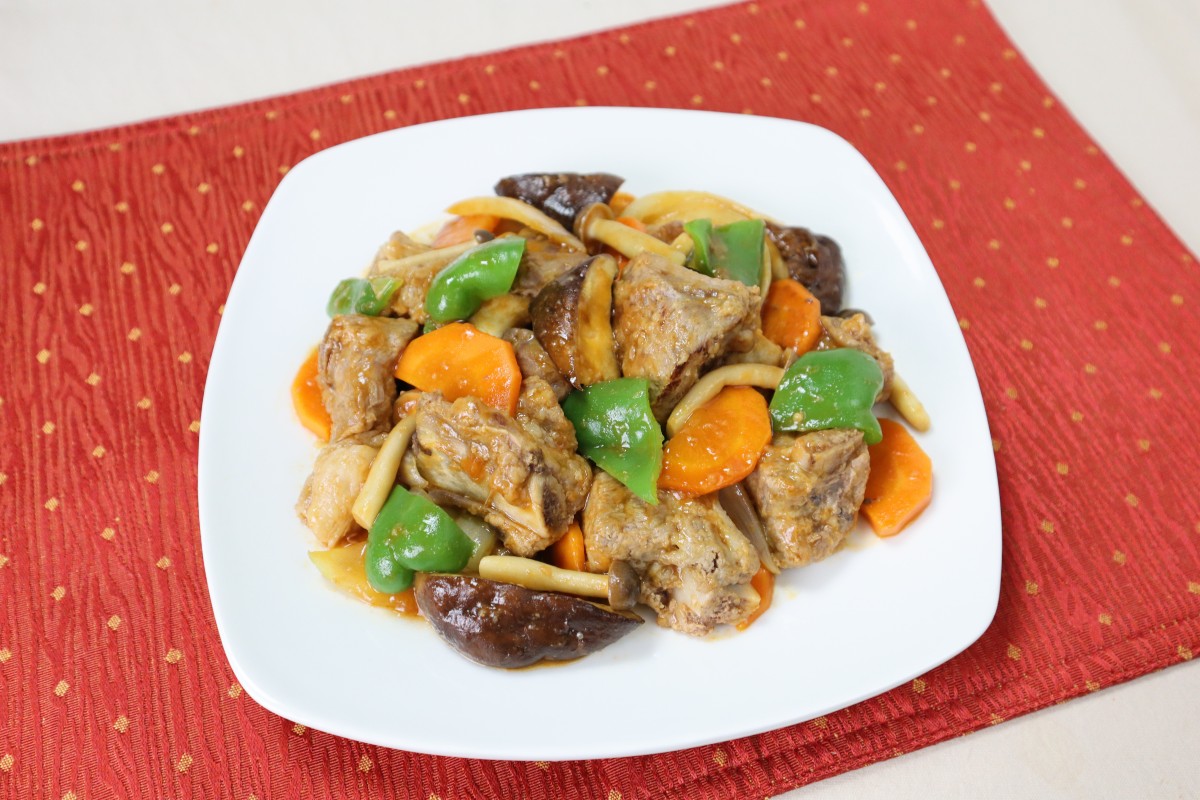 - フライパンに油大さじ1/2を熱し、たまねぎとにんじんを入れて炒める。 にんじんに火が通ったらしめじ、しいたけ、ピーマンを入れて炒める。 全体に火が通ったら水気をきったスペアリブを入れて混ぜる。