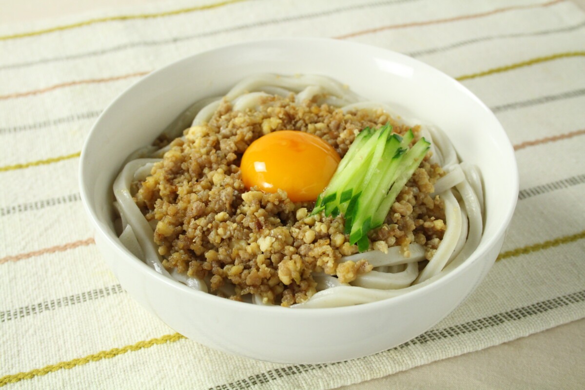 - うどんは茹でてザルにあげる。器に盛り、②、きゅうり、卵黄をのせる。