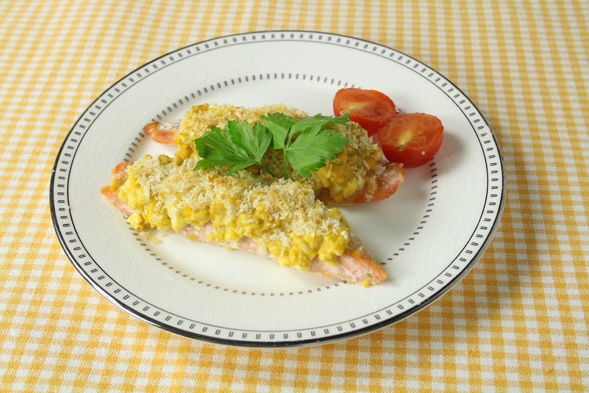 - 耐熱容器に鮭を並べ、②の1/3量をのせる。その上に自然派Style国産有機小麦をつかったマムのパン粉小さじ1をふりかける。オーブントースターで8~10分くらい焼く。焦げそうな時は途中でアルミホイルをかける。残りも同様にする。イタリアンパセリを添える。