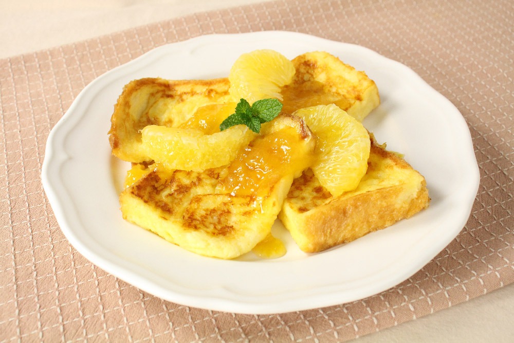 - フライパンにバターを溶かし、食パンを並べ入れて両面に焼き色がつくまで焼く。器に盛り、マーマレードと薄皮をむいた甘夏をトッピングしミントを添える。