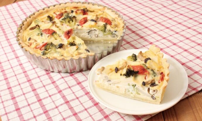 - ボウルに薄力粉と塩小さじ1/2を入れて泡立て器でよく混ぜる。別のボウルに豆乳、オリーブ油を入れて泡立て器でよく混ぜ合わせ、薄力粉の方に加えてヘラで切るようにして混ぜる。タルト型に生地をのせて広げ、フォークで穴を開ける。冷蔵庫で30分位ねかす。180℃に温めたオーブンで15~20分焼く