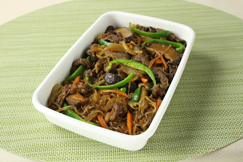 - フライパンに油を熱し、牛肉を入れて炒める。肉の色が変わってきたらにんじん、玉ねぎ、椎茸、ピーマンを順に入れて炒める。野菜に火が通ったら春雨、Bを加えて炒め合わせる。ごま油を回し入れてサッと混ぜ合わせる。