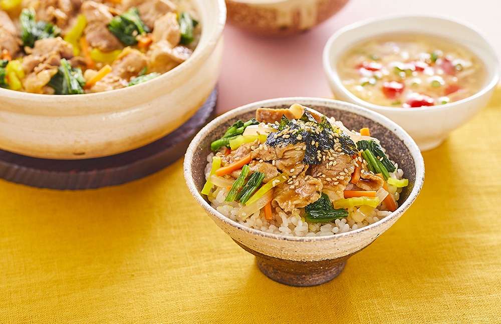 - フライパンに胡麻油大さじ1/2を熱し、豚肉を炒め、色が変わってきたらAを加えてさらに炒める。