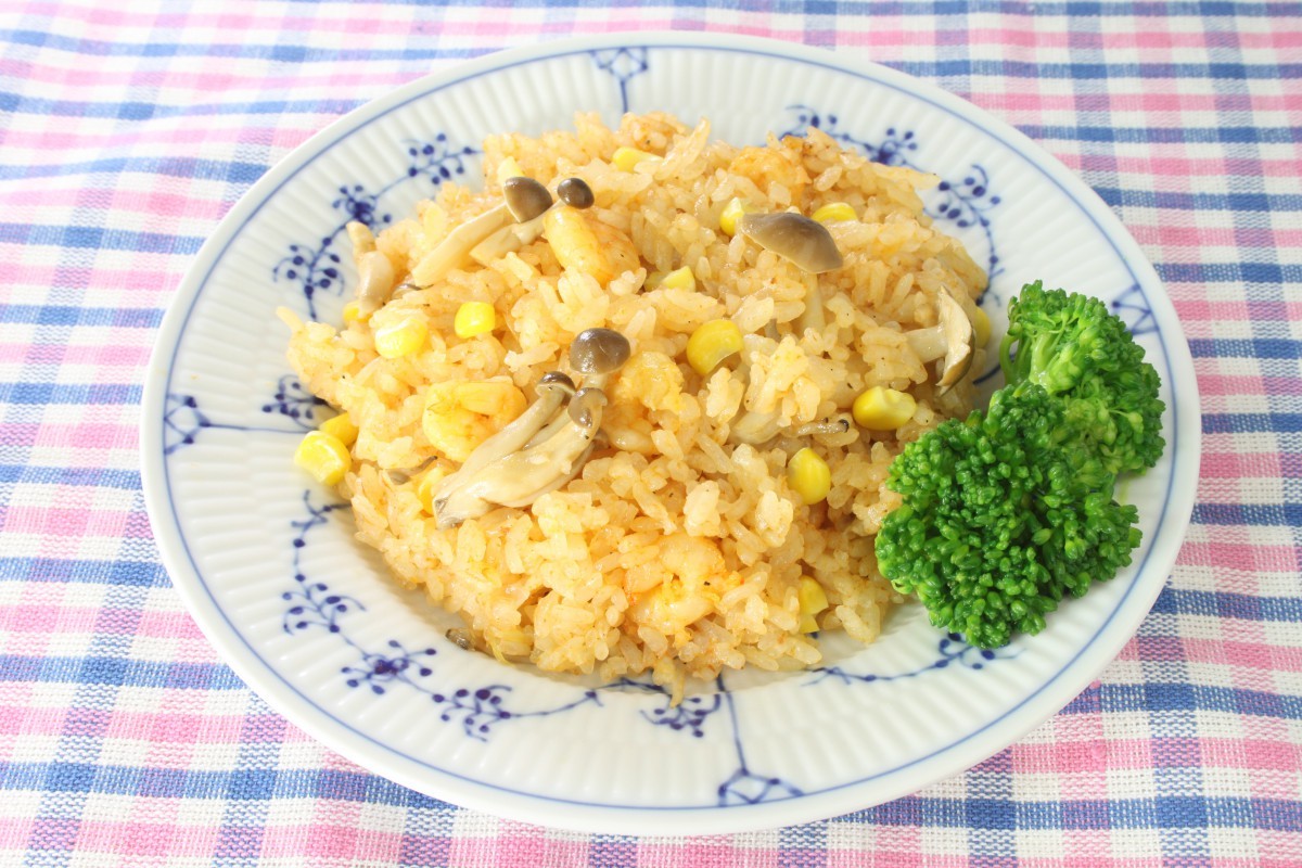 しめじは石突をとり、ほぐす。 - 炊飯器に①、えび、コーン、トマト鍋スープ、水340mlを入れ、混ぜ合わせて炊く。