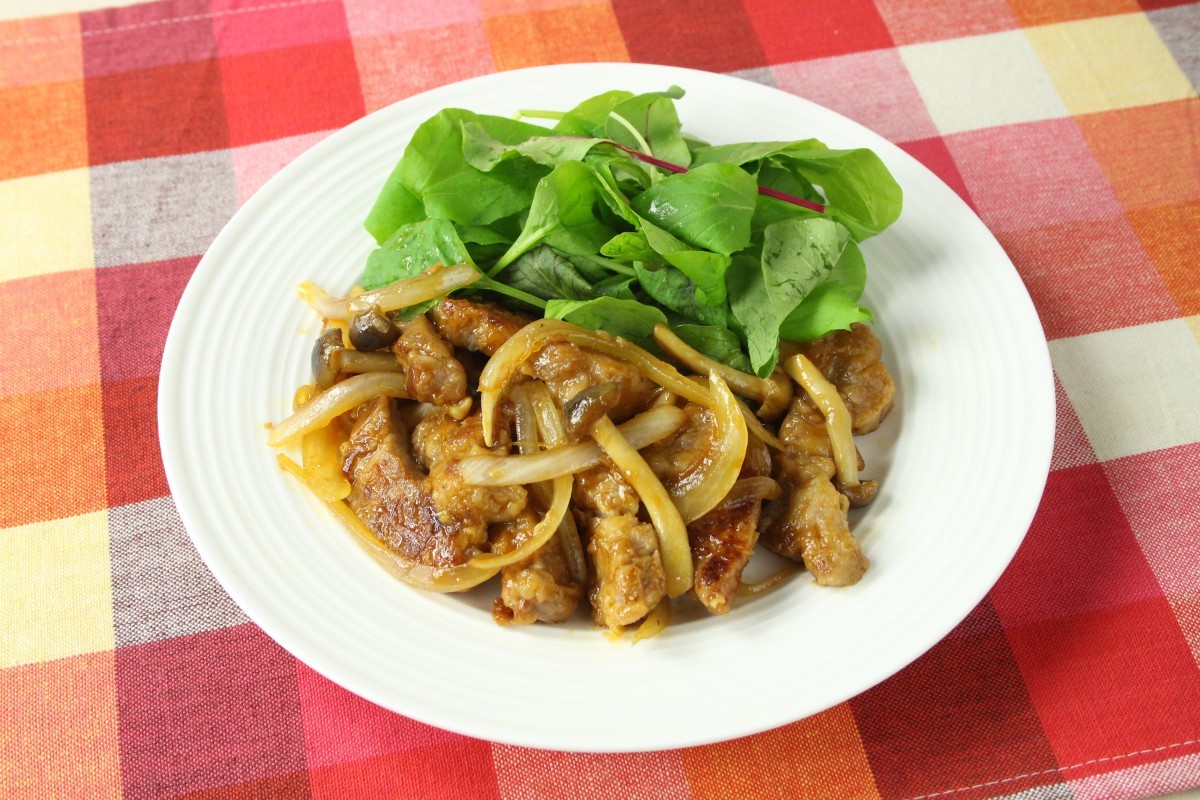 - フライパンにオリーブ油小さじ1を熱し、薄力粉をまぶした豚肉を入れ両面をこんがり焼き、火を通す。