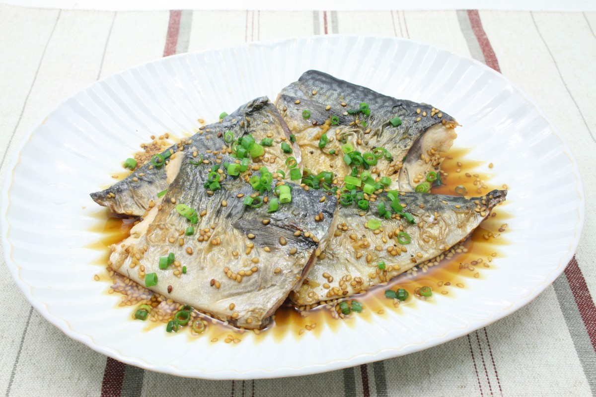 器にさばを盛り、小口切りにした細ねぎをちらす。