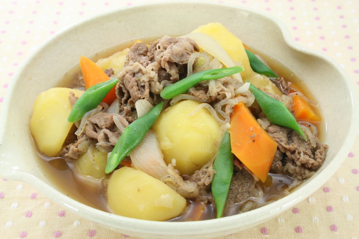 いんげんは熱湯でゆで、2~3cm長さに切る。 - フライパンに油を熱し、肉を炒め、色が変わったらじゃがいも、にんじん、玉ねぎ、自然派Style生いも糸こんにゃくを入れて炒める。