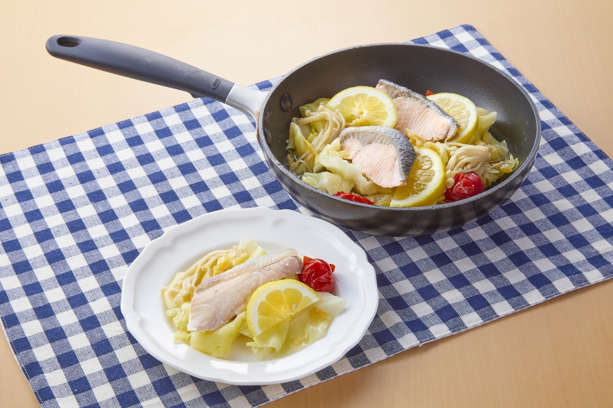 - 鮭は水気をふき取り、塩こしょうをする。キャベツはざく切りにする。