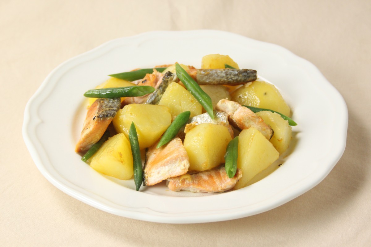 じゃがいもとさやいんげんを加えて1~2分炒める。