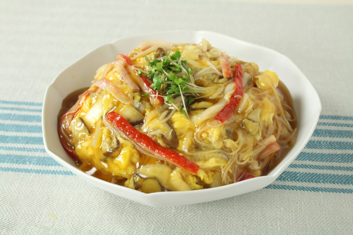 とろみがついたらかにかまを入れ、さらに混ぜながら約1分加熱する。 - ボウルに卵を溶きほぐし、Bを入れてよく混ぜ、白ねぎを加えて混ぜる。