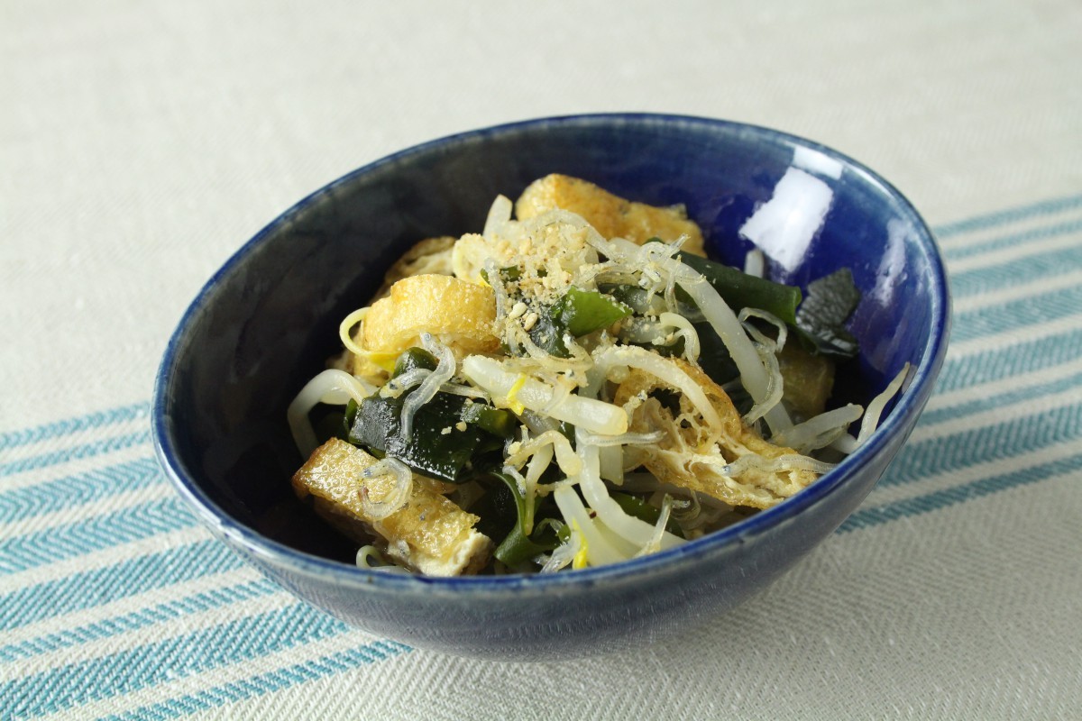 油揚げはオーブントースターでカリッと焼き短冊に切る。