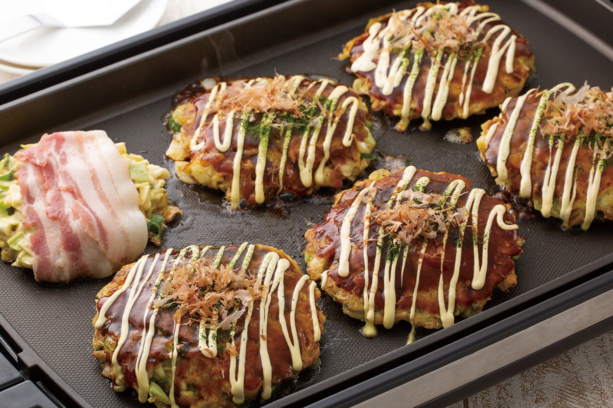 - フライパン(ホットプレート)に油を入れて中火で熱し、生地を流し入れ、豚肉を広げて乗せ、裏面に焼き色が付くまで焼く。豚肉の面が下になるよう返し、火が通るまで焼く。焼けたらソース、青のり等をかける。