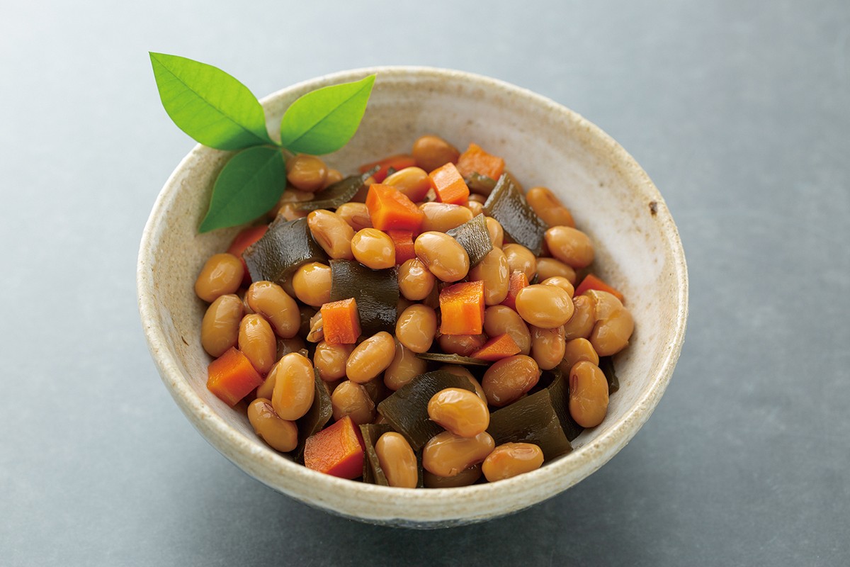 - 鍋に蒸し大豆、にんじん、ひたひたの水と昆布を入れ、火にかける。