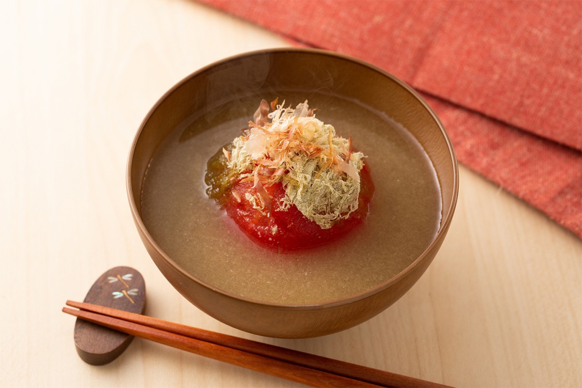 トマトの穏やかな酸味でさっぱりなのに旨みのあるお味噌汁。トマトにはうま味成分のグルタミン酸が含まれています。